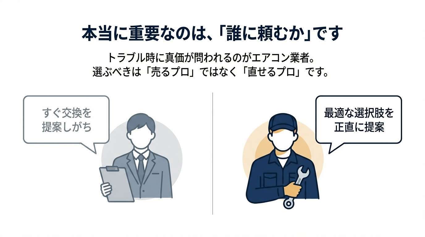 世の中には、工事は下請けに丸投げの「販売代理店」も多く存在します。そういった業者は修理技術を持たないため、何かトラブルがあるとすぐに「買い替え」を提案しがちです。