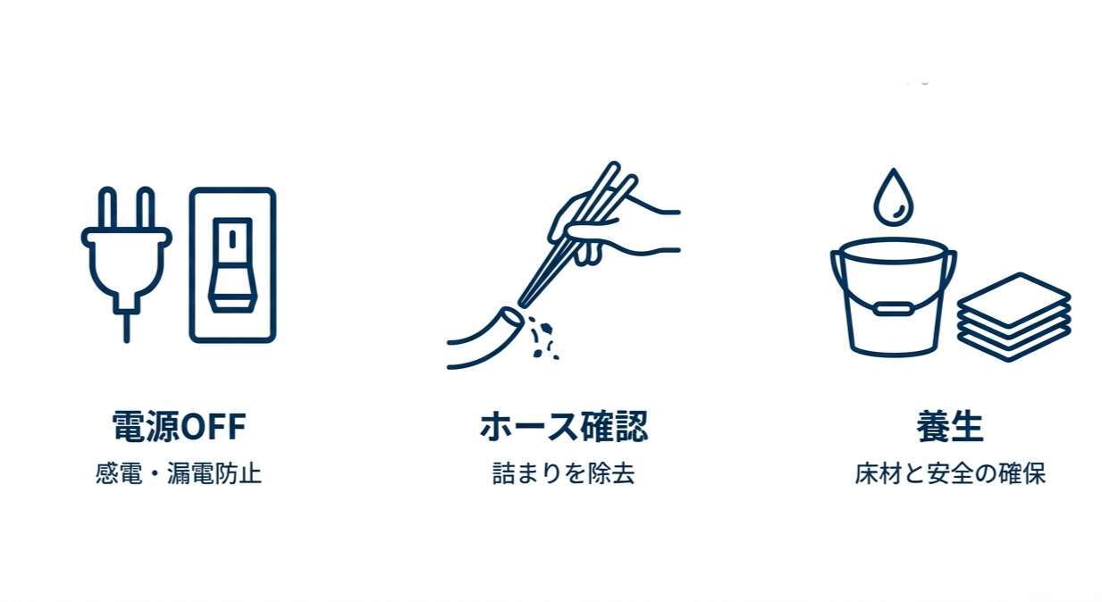 ですが、業者が到着するまでの間にも、店舗の内装や商品はダメージを受け続けてしまいます。 まずはご自身でできる3つの初期対応を行い、状況を落ち着かせましょう。