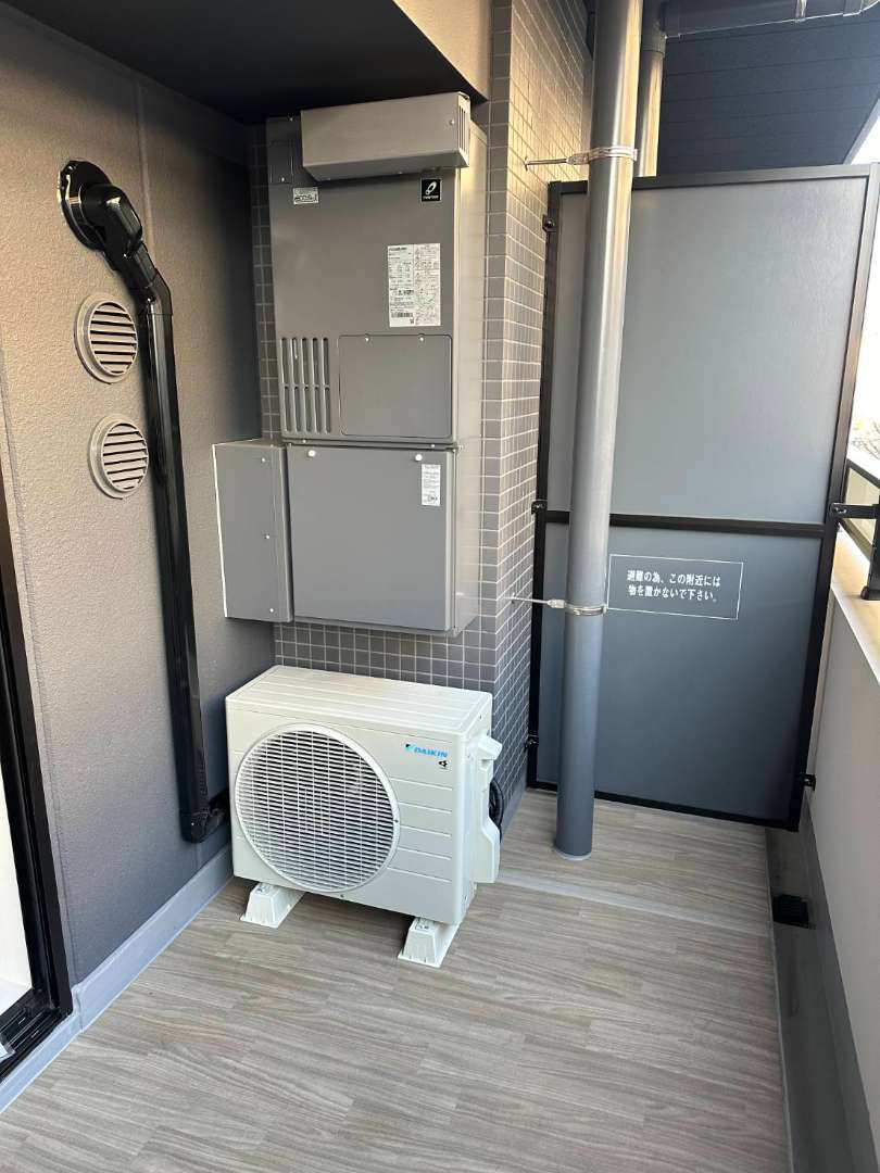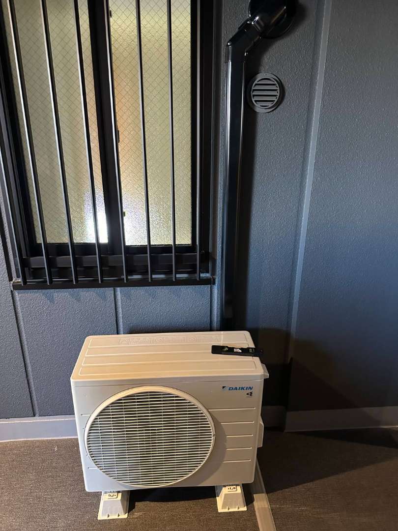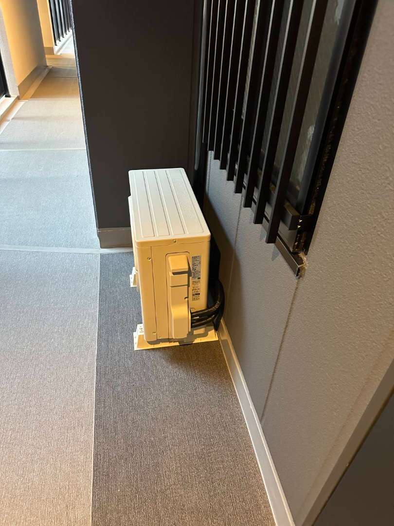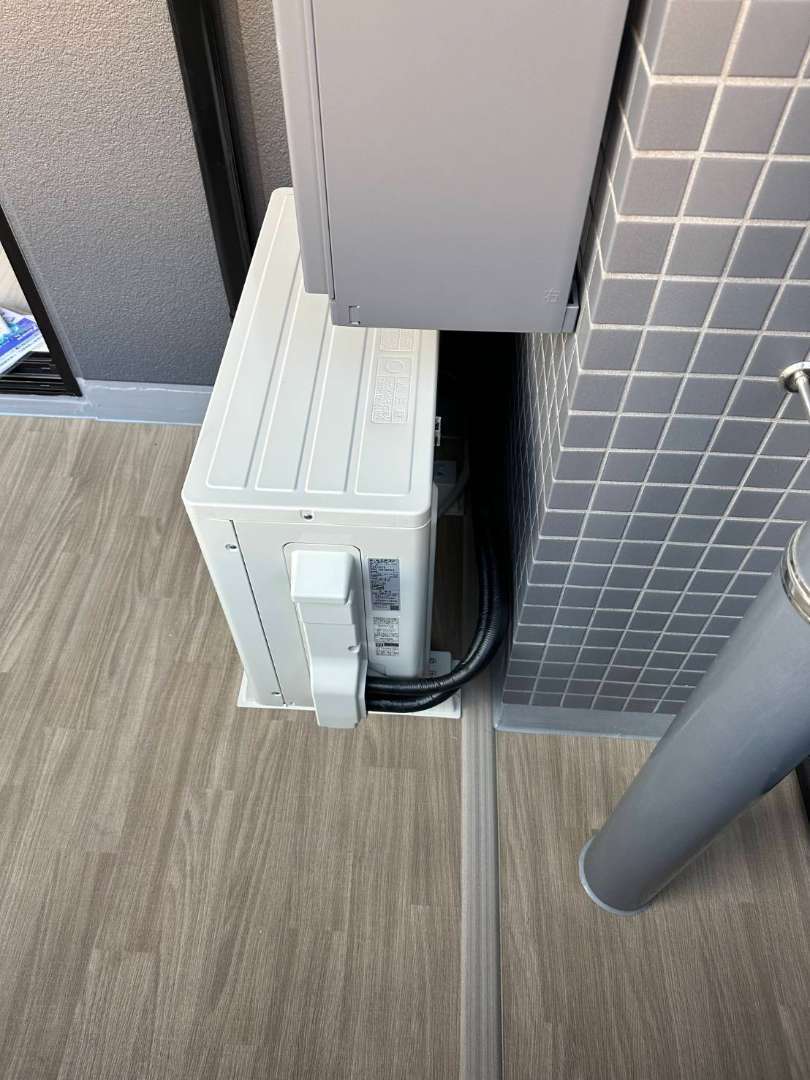 ベランダや共用廊下の限られたスペースにおいて、室外機を最適な位置に配置。避難経路の確保や給湯器との干渉にも配慮し、安全性とメンテナンス性を両立させました。