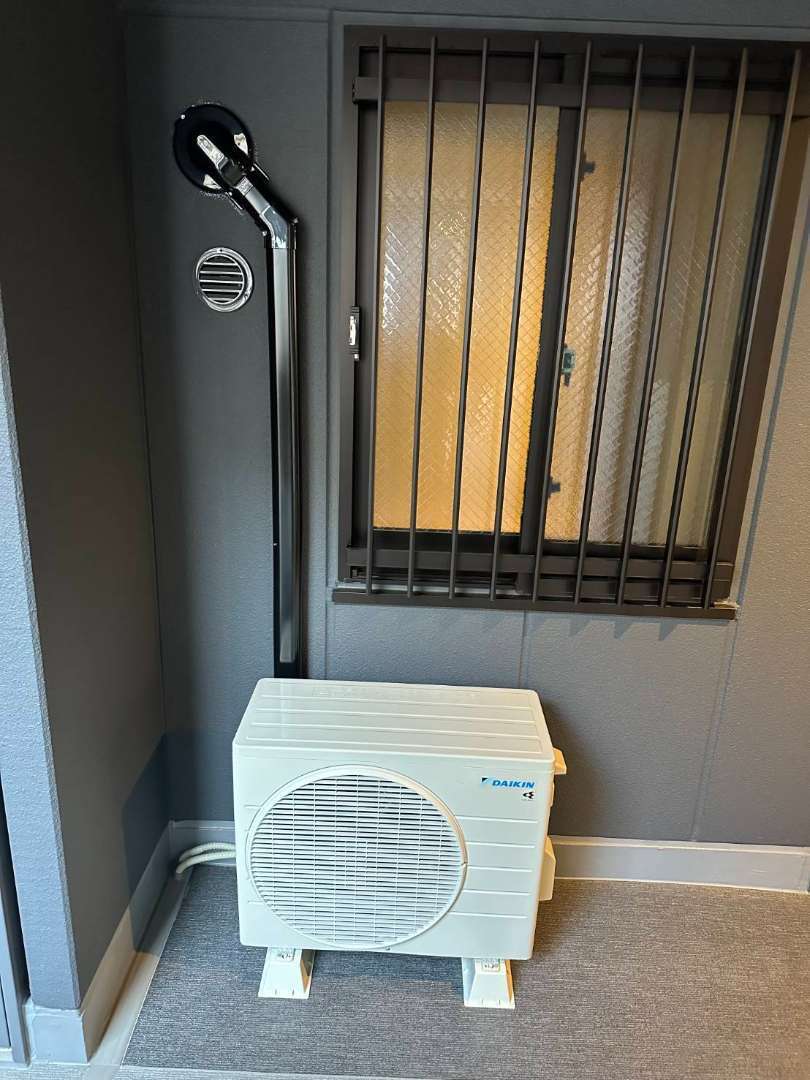 室内は壁紙に馴染むホワイトの化粧カバーを、室外はマンションの外壁(ダークグレー系)に合わせたブラックの化粧カバーを採用。建物のデザインに溶け込む、後付け感のないスマートな仕上がりを実現しました。