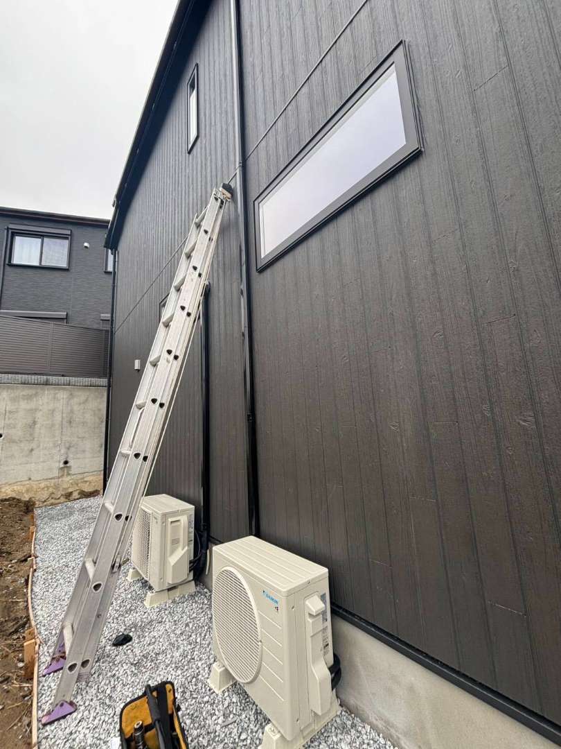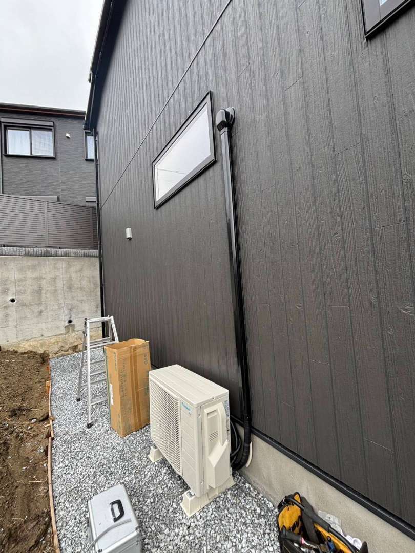 新築のお住まいでエアコンを設置する際、多くのお客様が「外観のデザインを損ないたくない」「配管が目立つのは避けたい」とお考えになります。今回のお住まいは、モダンで洗練された黒系の木目調外壁を採用されており、標準的なテープ巻き仕上げや、外壁に合わない色の配管カバーを使用すると、せっかくの美しい外観から浮いてしまうという懸念がありました。