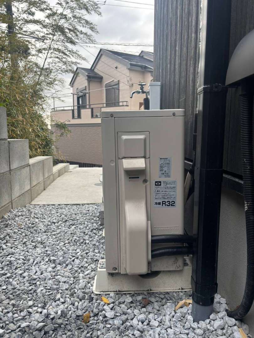 室内機につきましても、各お部屋のレイアウトに合わせて最適な位置に丁寧に取り付けを行っております。室外機は砂利敷きのスペースや立水栓の近くなど、それぞれの環境に合わせて樹脂製の架台(プラブロック)を使用し、水平をしっかりと保って安全に設置いたしました。